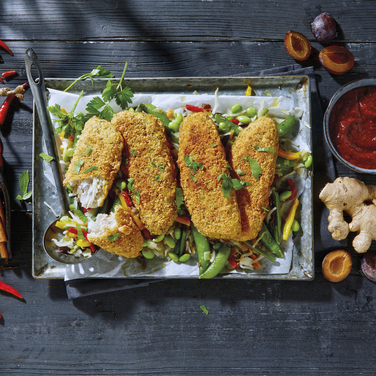 Fisch in Tempura Panade mit pikanter Pflaumensauce
