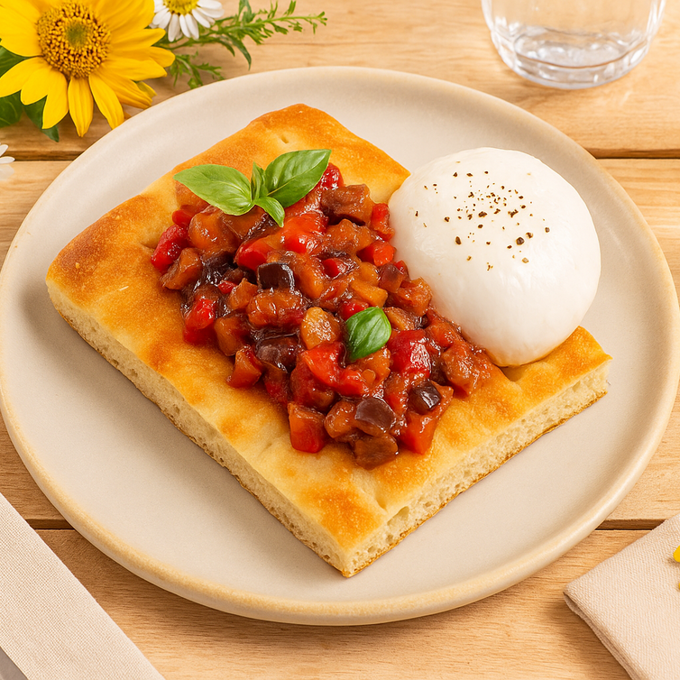 Una focaccia pronta in pochi minuti, farcita con caponata Eismann e burrata fresca. L’ideale per aperitivi estivi e piatti vegetariani.