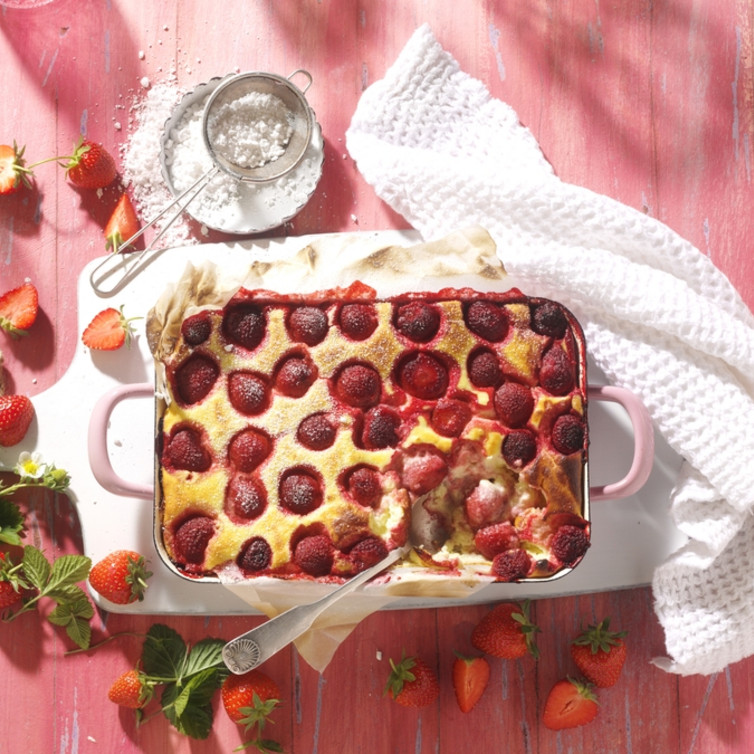 Teig in eine gefettete Auflaufform geben, Erdbeeren darauf verteilen und im vorgeheizten Backofen bei 180 °C Ober-/Unterhitze Eco (160 °C Heißluft Eco) ca. 30 Minuten backen.