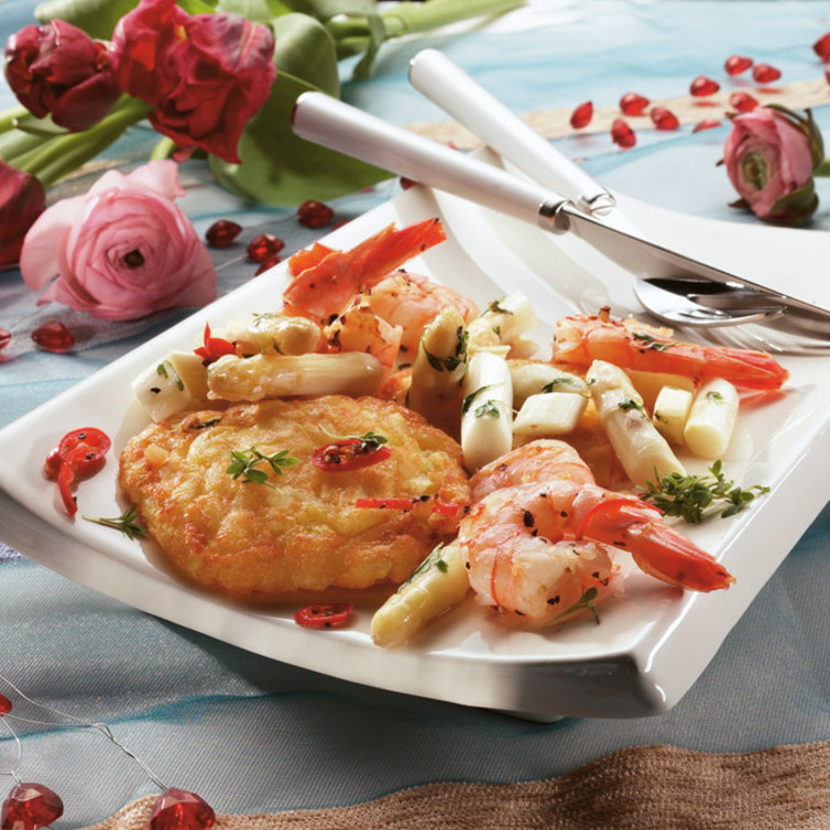 Spargel und Garnelen auf Teller verteilen und dazu Röstinchen servieren.