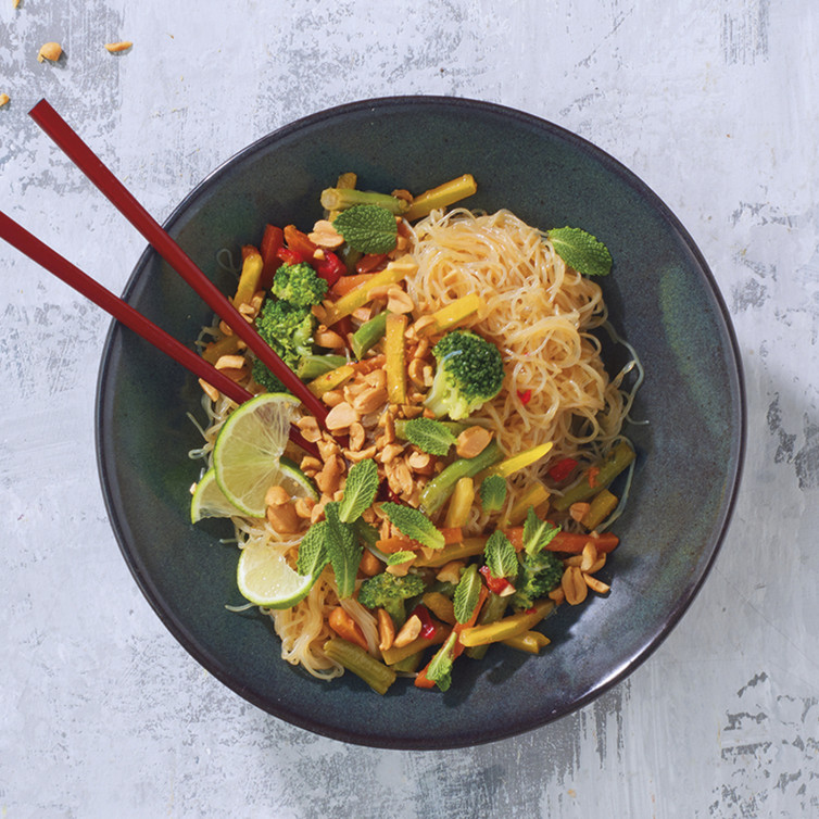 Aus Sojasauce, Honig, Limettensaft und -Abrieb ein Dressing anrühren. In einer großen Schale die Glasnudeln mit der Gemüsepfanne und dem Dressing vorsichtig vermengen. Minzblätter unterheben und mit gesalzenen Erdnusskernen bestreuen.
