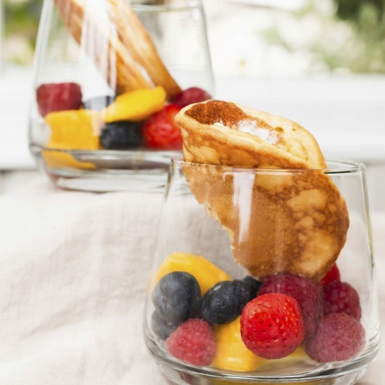Mascarpone, Joghurt und etwas Honig verrühren. Die Pancakes mit der Creme füllen, zuklappen und jeweils einen Pancake auf den Obstsalat legen.