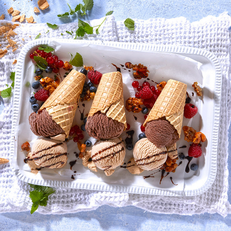 Von den Waffelhörnchen die Spitzen abschneiden. Nun pro Portion ein Hörnchen auf die vorbereiteten Teller legen.