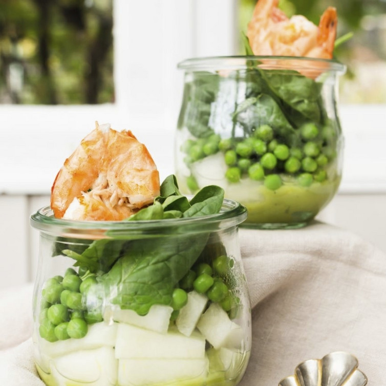 Die einzelnen Zutaten schichtweise in die Gläschen geben: Avocado Dip, Melone oder Ananas, Erbsen, Spinat oder Wildkräuter und mit einem Spieß fixiert die Garnele.