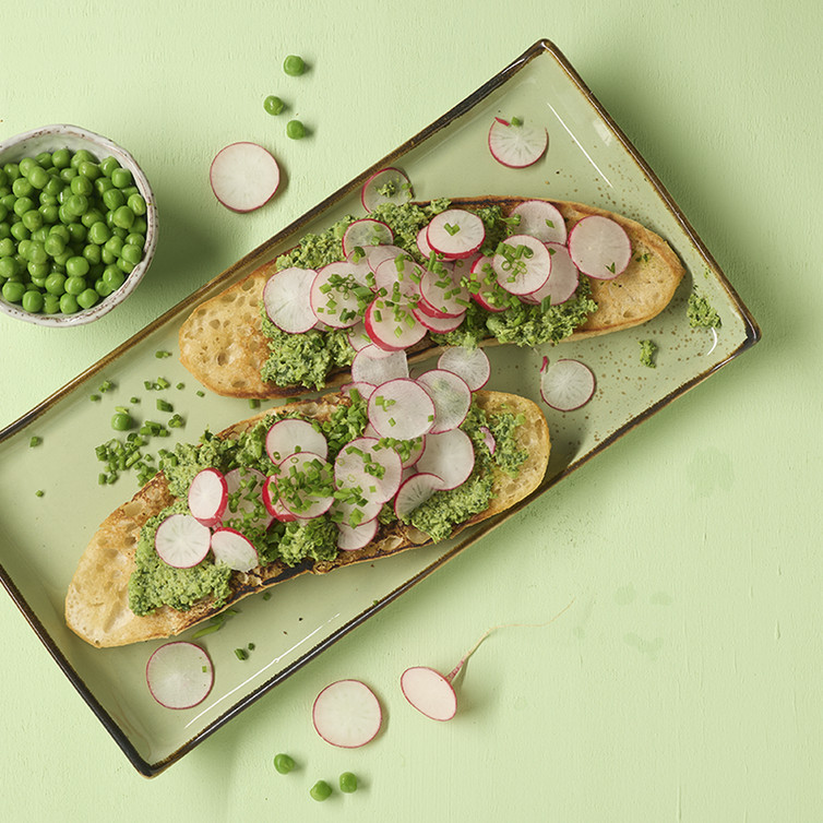 Die Brotscheiben in einem Toaster knusprig rösten. Den Erbsen-Hummus in eine Servierschale füllen, mit etwas Olivenöl beträufeln und mit Schnittlauchröllchen bestreuen. Das Knusperbrot und die gehobelten Radieschen dazu reichen.