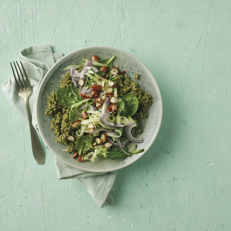 Den Couscous in mehrere Gläser oder eine Schale füllen und schichtweise mit Mandeln, Zwiebelringen, Zucchini und Babyspinat auffüllen. Der Salat lässt sich sehr gut am Vortag zubereiten und hält sich kühl gestellt lange frisch.