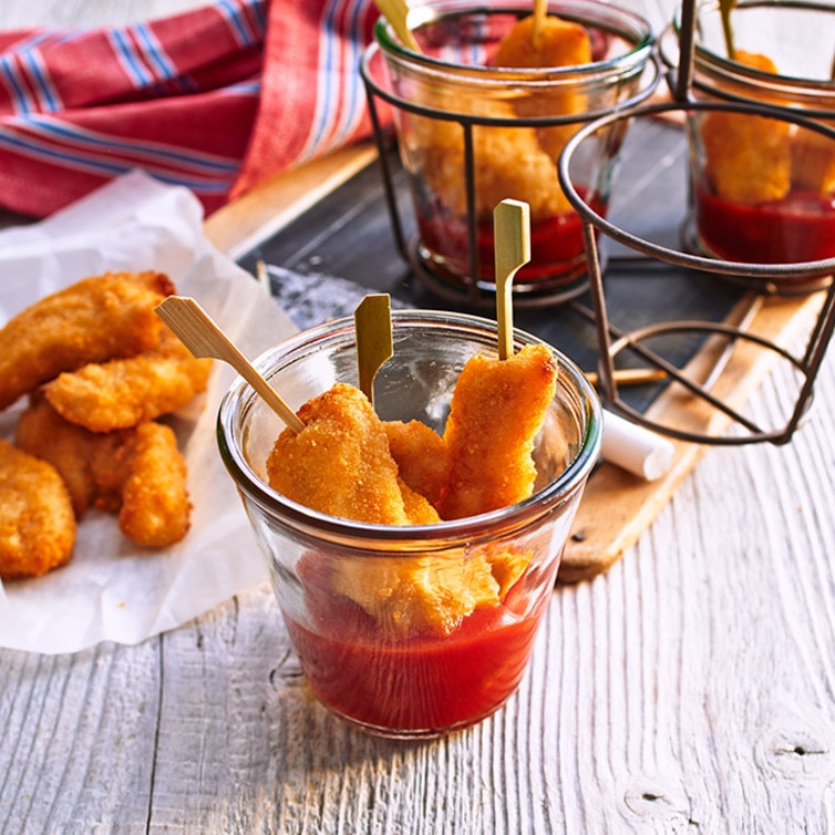 In die kleinen Tütchen oder Gläser jeweils Ketchup oder Salsasoße füllen und die Hähnchenstreifen mit den Tandoorispießen aufgespießt in die Tütchen oder Gläser stellen, so dass die Spitze schon mit Ketchup bedeckt ist.
