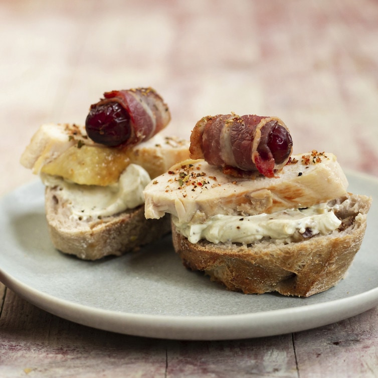 Die Brotscheiben mit Dattelcreme bestreichen, die Hähnchenstreifen darauflegen und mit der Dattel im Speckmantel dekoriert servieren. Wer mag, streut noch etwas Kresse über die Häppchen.