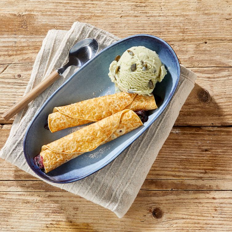 Den Pfannkuchen auf einem vorgewärmten Teller anrichten. Eine Kugel Pistazien-Eis dazu geben und mit Kürbiskernöl dekorieren.