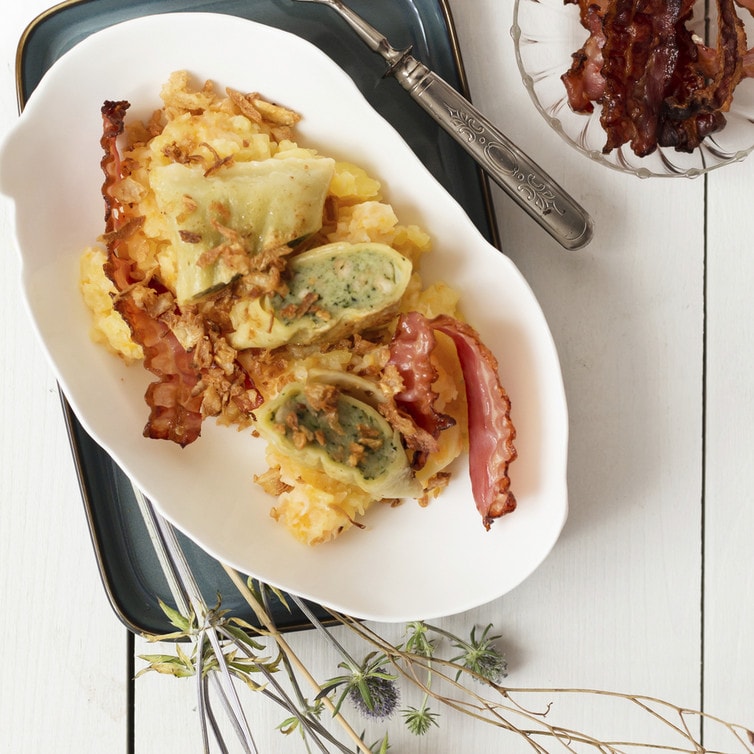 Die Maultaschen einmal halbieren und auf dem Stampf mit Bacon und Röstzwiebeln anrichten. Mit frischem grobem Pfeffer bestreut servieren.