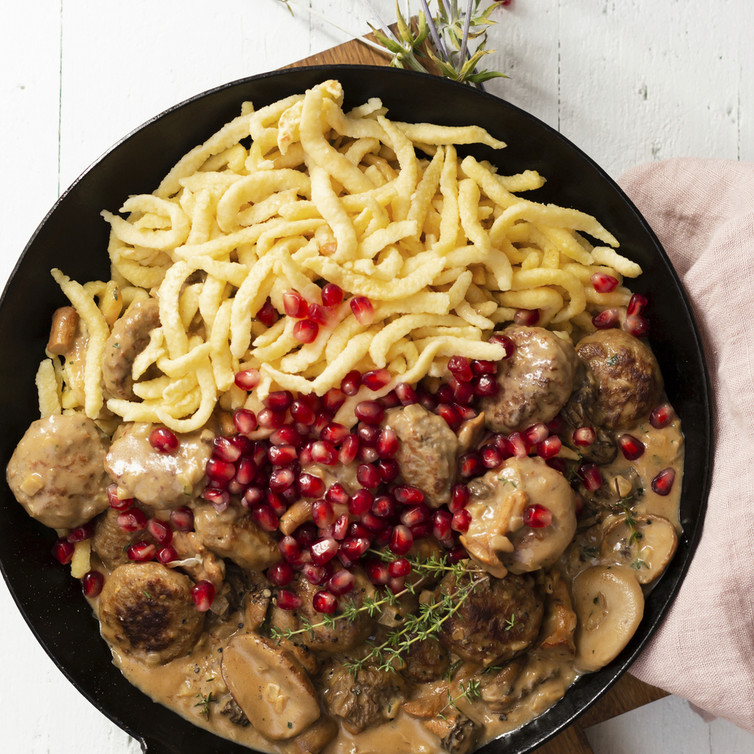 Jägertopf mit Frikadellen, Spätzle und Granatapfel