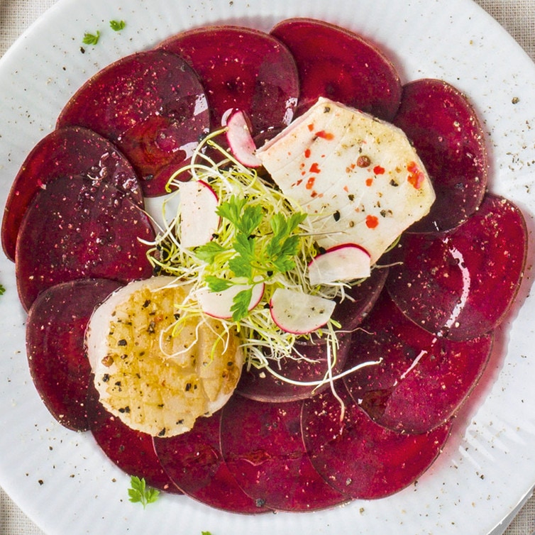 Jakobsmuschel und Schafskäse an Rote Beete Carpacchio