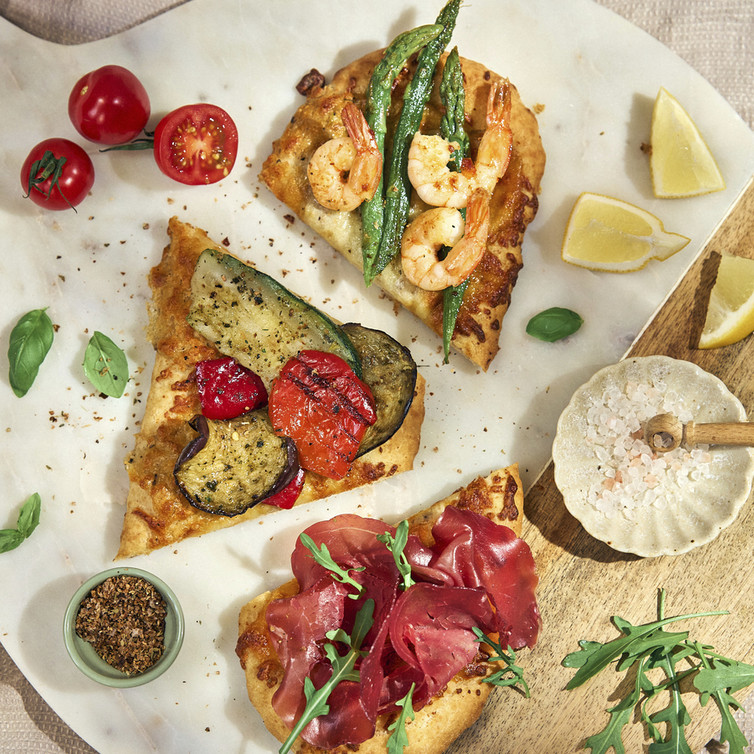 Die fertig gebackenen Pizzen auf einem Brett jeweils in drei Stücke schneiden und individuell belegen: Mit Mediterranem Grillgemüse Mit grünem Spargel und Riesengarnelen Mit Rucola und würzigem Bresaola-Schinken