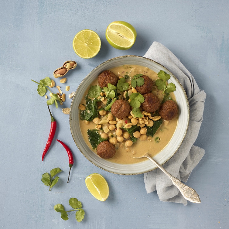 Die veganen Kein-Hack-Bällchen in tiefe Teller oder Schalen geben, das Curry darüber verteilen und mit frisch gezupften Korianderblättern sowie gehackten Erdnüssen bestreut servieren.