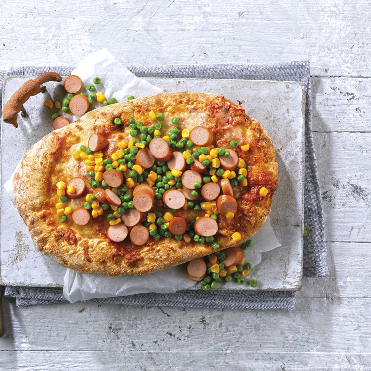 Die Pinsa mit den Würstchen und dem Gemüse belegen und servieren.