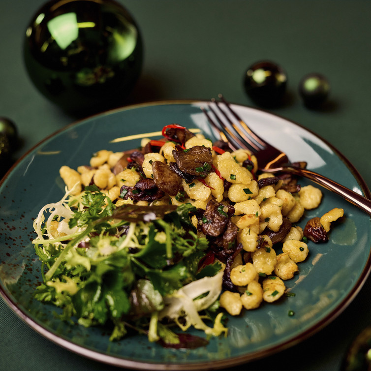 Ein vegetarisches Gericht mit feiner, herzhafter Note. Die Kombination aus zarten Knöpfle, frischen Wildkräutern und aromatischen Pilzen sorgt für ein harmonisches Geschmackserlebnis – inspiriert von Johann Lafer und perfekt für Genießer der saisonalen Küche.