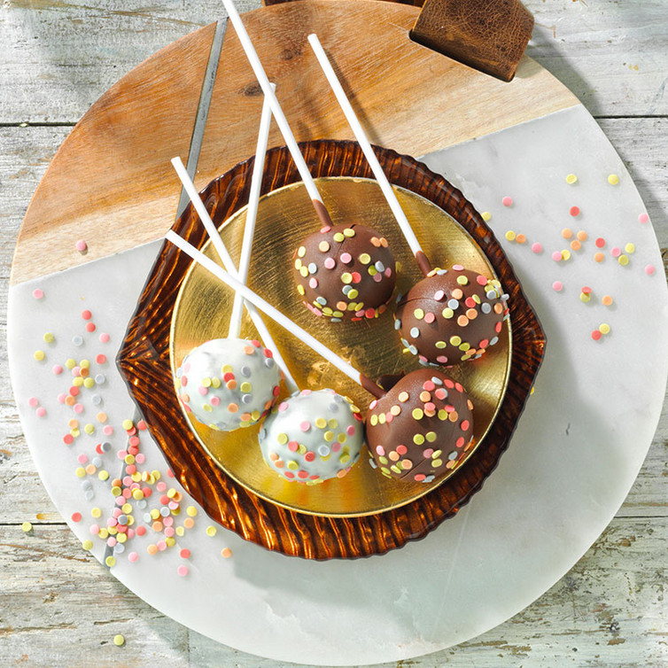 Bällchen einzeln in die weiße oder dunkle Kuvertüre tauchen, mit Streuseln dekorieren, z.B. in einem Cake Pop-Ständer trocknen lassen und anschließend servieren.