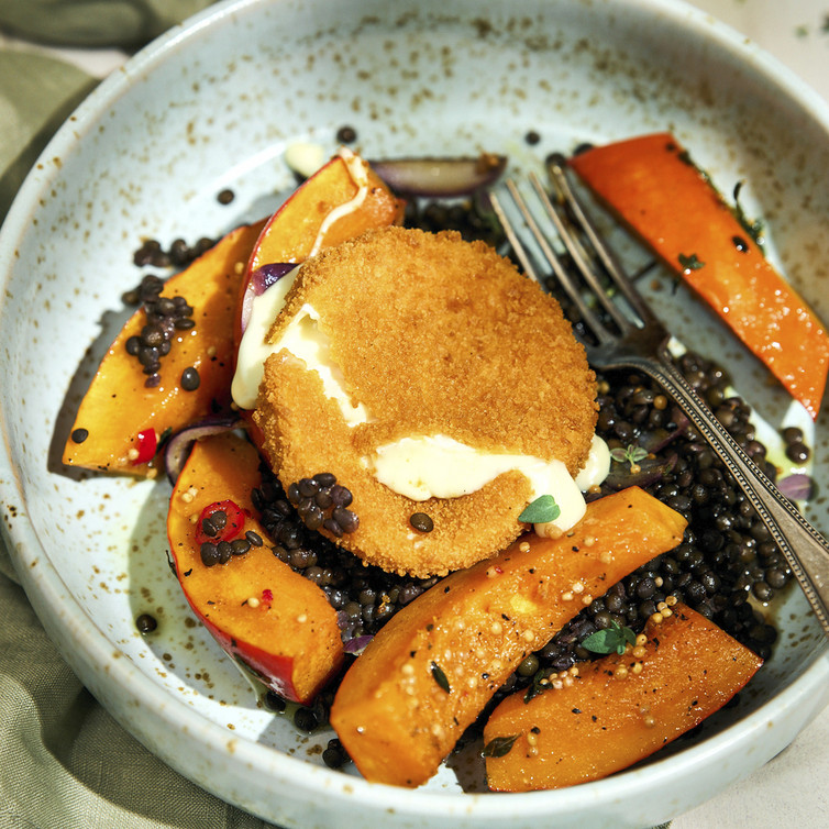 Die warmen Linsen mit dem gerösteten Kürbis und den Zwiebeln vermengen. Das Dressing darüber geben und behutsam vermischen. Den knusprigen Camembert daraufsetzen und sofort servieren.