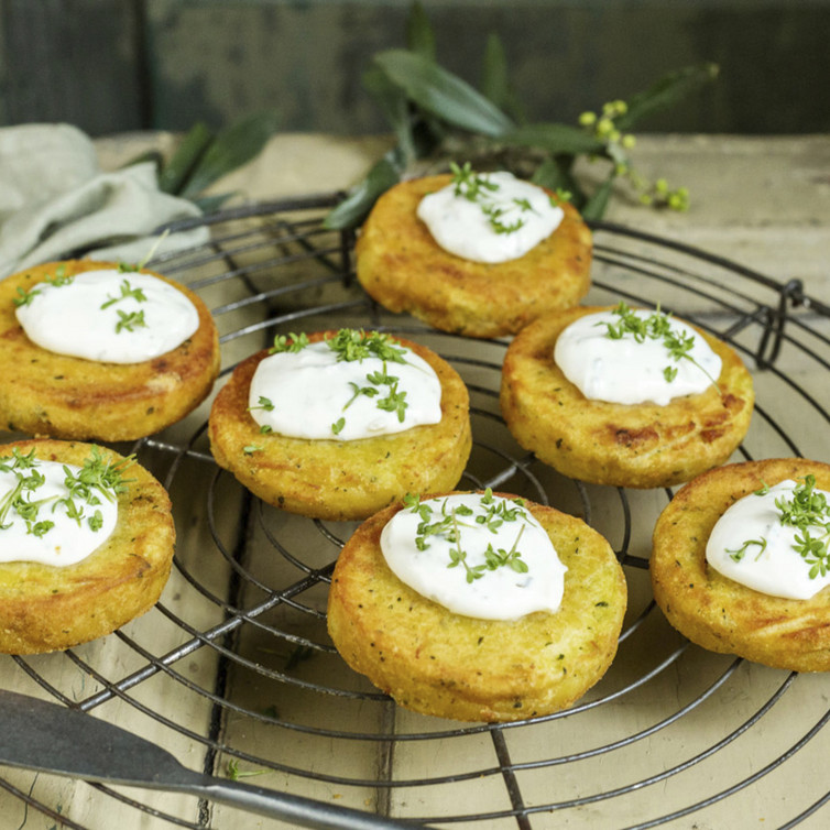 Die Hälfte der Kresse unter den Dip rühren. Auf die fertigen Macaire-Kartoffelplätzchen einen Klacks Dip geben und mit der restlichen Kresse dekorieren.