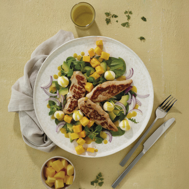 Mango-Avocado-Salat mit Hähnchen-Filetspitzen und Mozzarella