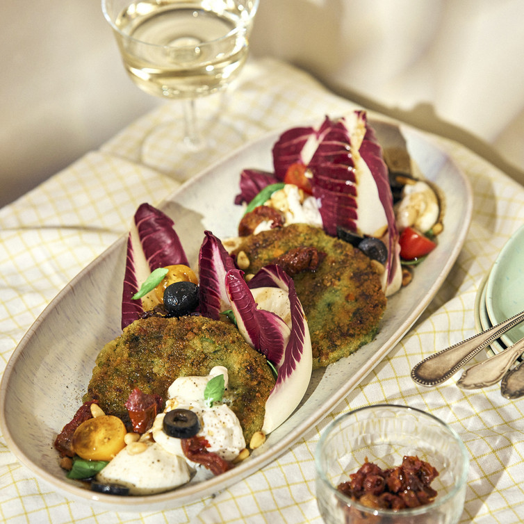 Mediterraner Genuss auf dem Teller: Cremige Burrata, würzige Spinat-Käse-Taler und aromatische Oliven treffen auf knackigen Radicchio und sonnengereifte Tomaten. Ein Gericht, das Urlaubsgefühle weckt und mit jedem Bissen ein Stück mediterrane Leichtigkeit bringt.