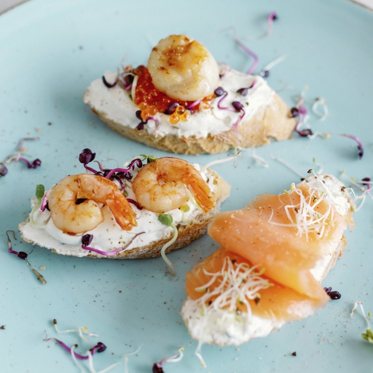 Die Brotscheiben mit Creme Fraîche bestreichen und mit Räucherlachs, Forellenkaviar und Jakobsmuscheln und Riesengarnelen belegen.