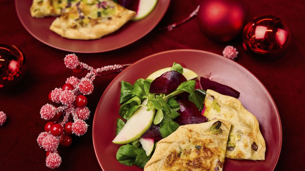 Knusprige Mini-Flammkuchen mit Feldsalat, roter Bete und grünem Apfel – eine festliche Komposition nach einem Rezept von Johann Lafer. Einfach anrichten und genießen.