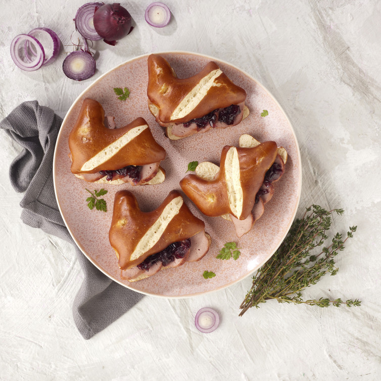 Mini-Leberkäse mit Zwiebelconfit und Laugenhäschen