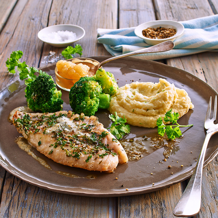 Den Broccoli in Butter schwenken, mit Bärlauchsalz abschmecken, das Kartoffelpüree mit gehackter Petersilie würzen.
