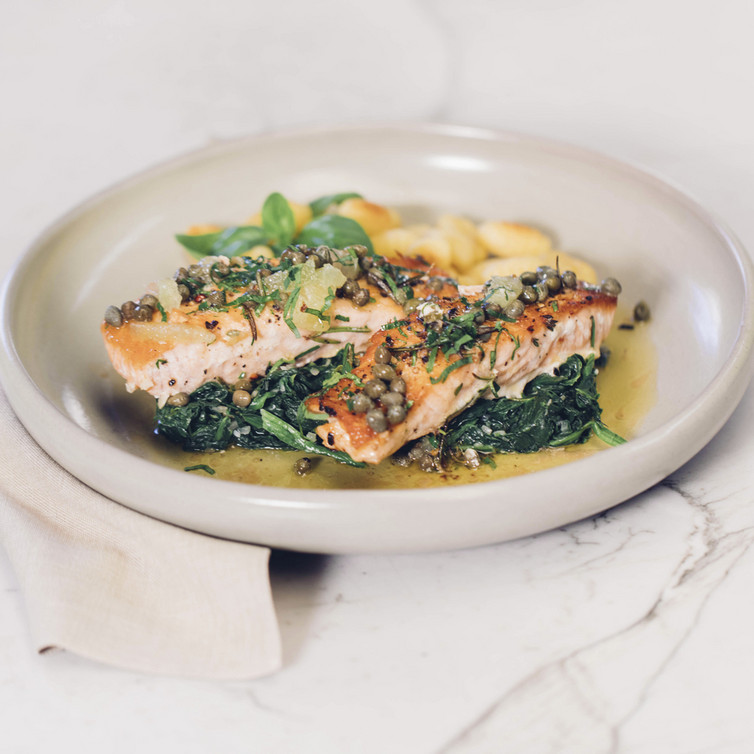 Norwegisches Lachsfilet in Limonen-Kapernbutter mit Blattspinat & Gnocchi (von Johann Lafer)