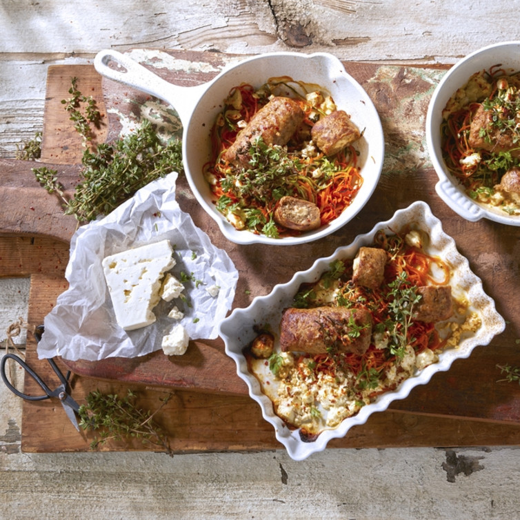 Ofen-Zoodles mit Hackröllchen "Hirten Art"