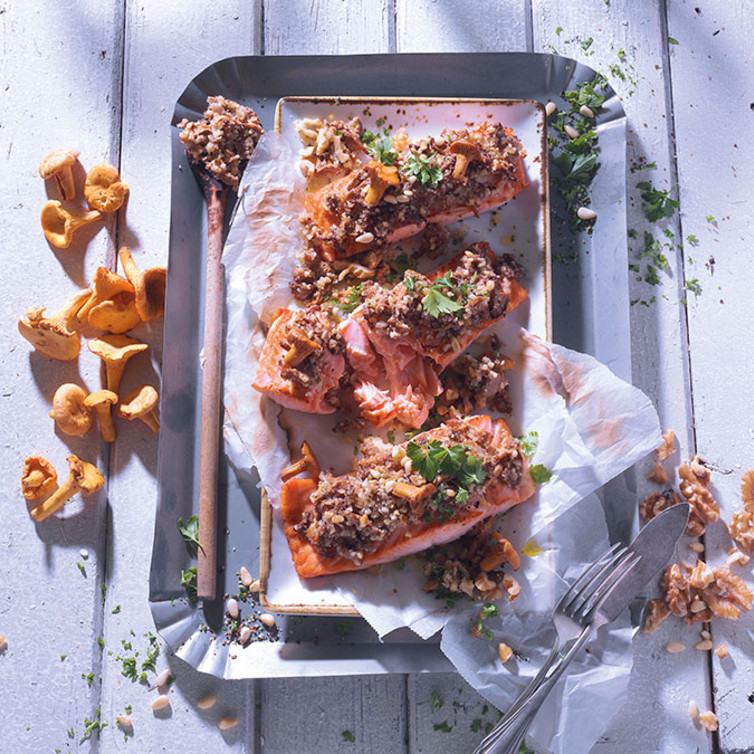 Zubereitung für Ofenlachs mit Pfifferlings-Kruste