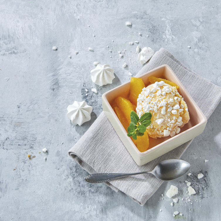 Die Orangenfilets in Portionsschüsselchen anrichten. Das Eis zu vier großen Kugeln portionieren und mit den Baiser-Bröseln panieren und auf die Filets setzen.