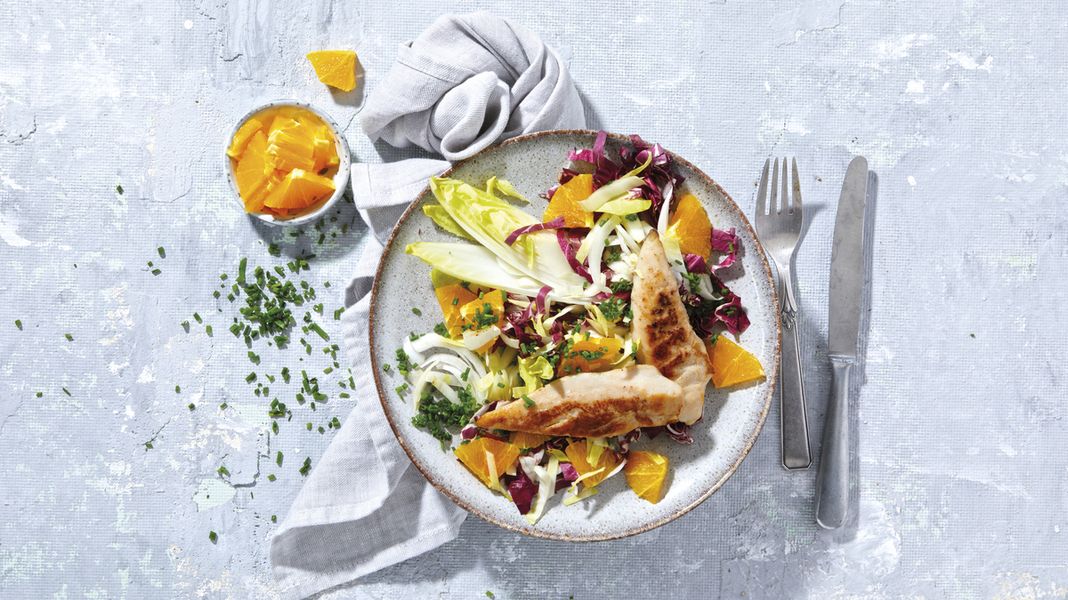 Salat locker auf Tellern verteilen. Hähnchen-Filetspitzen und Orangenviertel dazu anrichten, mit der Vinaigrette beträufeln und Schnittlauchröllchen darüberstreuen.