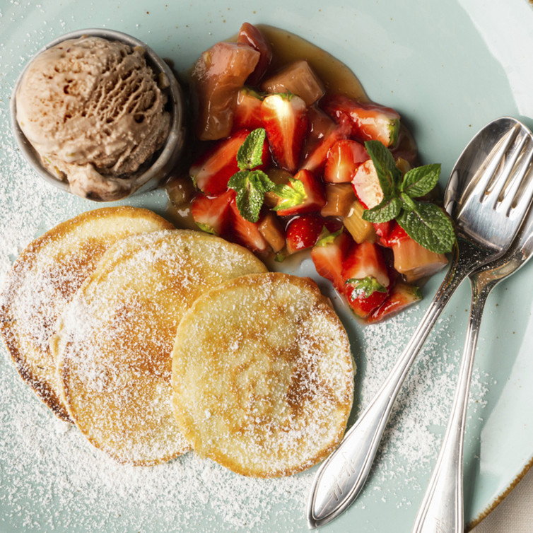 Pancakes mit Kaffeehaus Eis und Rhabarber-Erdbeerkompott (von Johann Lafer)