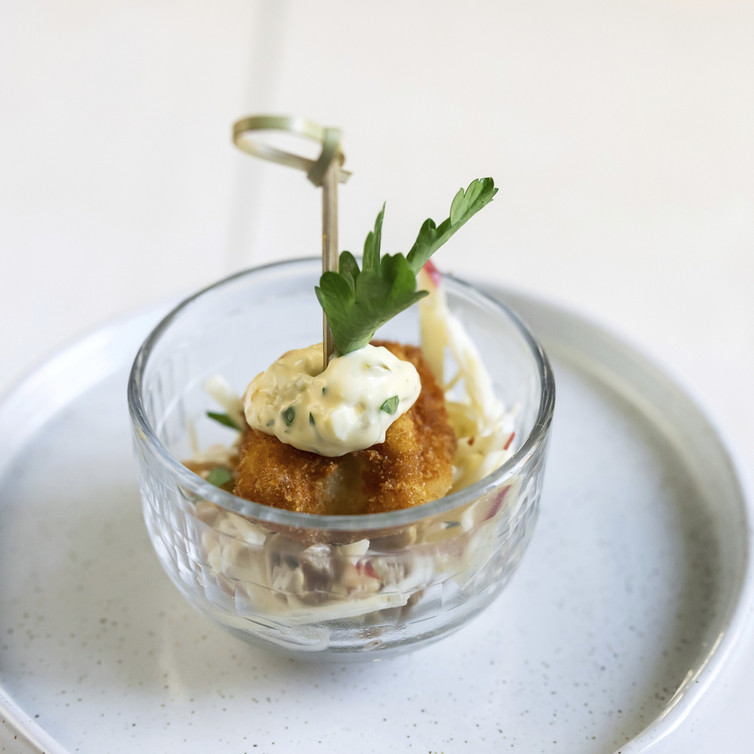 Waldorfsalat in kleine Schüsseln geben, die gebackenen Hähnchenbrustwürfel auf den Salat setzten. Remouladensoße auf die Würfel geben und mit Blattpetersilie garnieren.