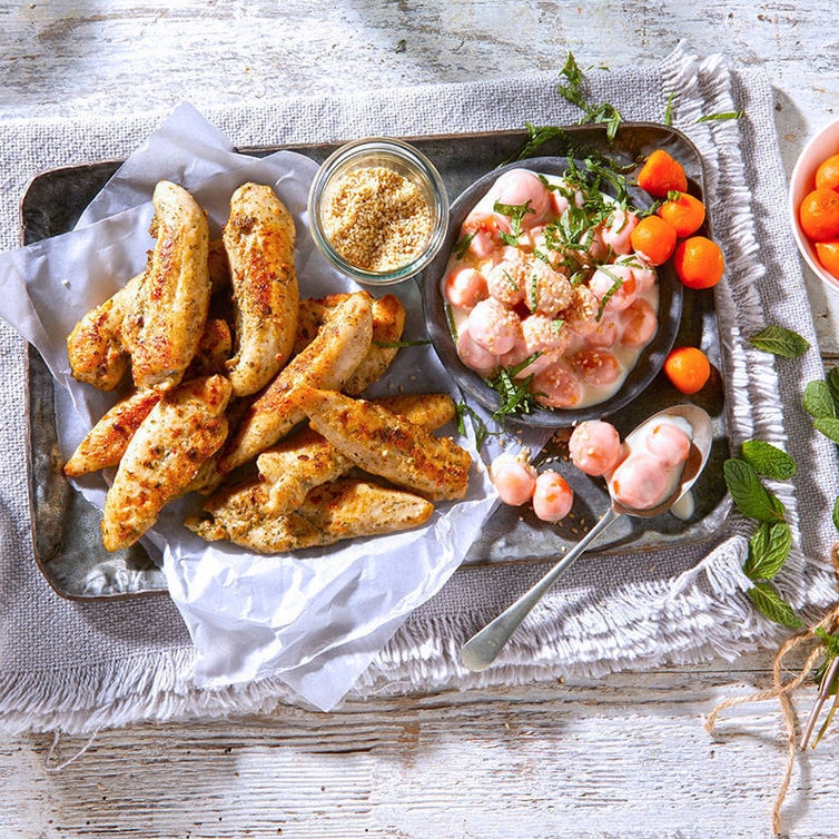 Die Karotten mit Salz und frischem Pfeffer würzen, Sour Cream oder Schmand unterziehen, ggf. noch einmal nachwürzen. Die Streifen von Minze unterheben und das Gemüse mit dem gerösteten Sesam vor dem Servieren bestreuen. Dazu die gebratenen Hähnchenfiletspitzen anrichten.