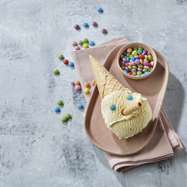 Auf einen Dessertteller ein paar Schokolinsen streuen, die Kugel Eis daraufsetzten und dekorieren: Schokolinsen für die Augen, Hohlhippe als Nase und Waffelhörnchen als Hut. Sofort servieren.