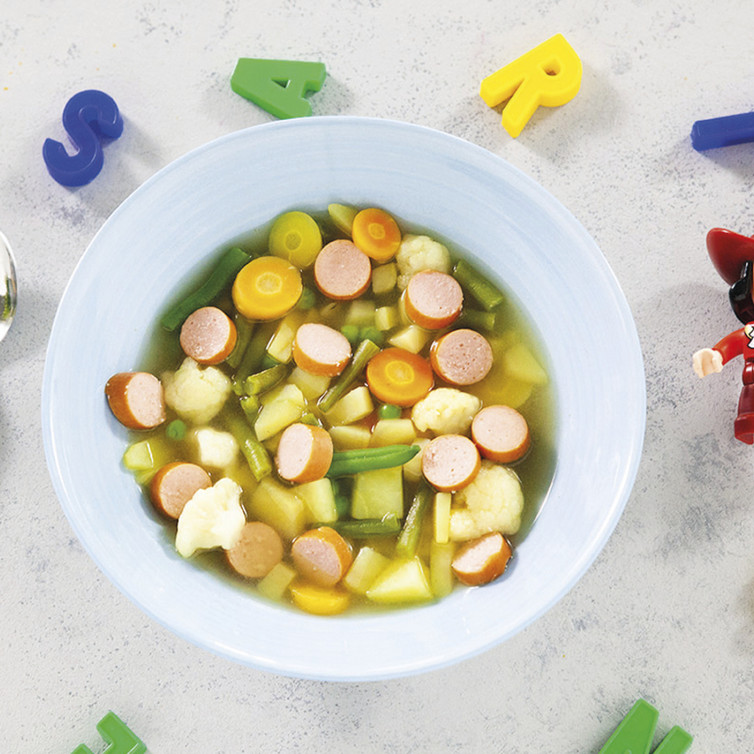 Die Gemüsebrühe zum Kochen bringen und die Kartoffeln und das Gemüse darin ca. 10 Minuten garen. Kurz vor dem Ende die in Scheiben geschnittenen Würstchen dazu geben und mild mit Salz und Pfeffer abschmecken.