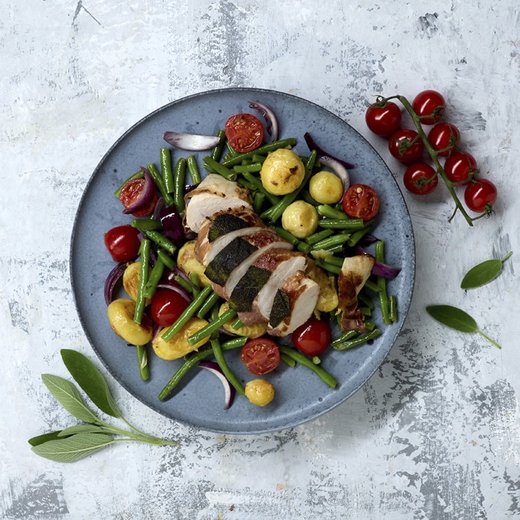 Hähnchen-Saltimbocca auf mediterranem Ofengemüse