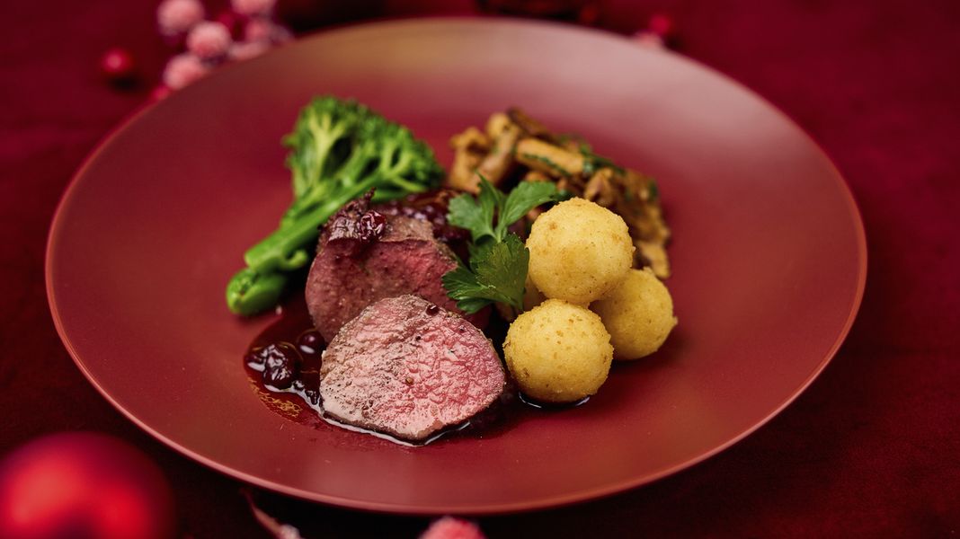 Zarte Rehmedaillons mit feinen Butterklößchen, Mini-Brokkoli, Pfifferlingen und Preiselbeeren – ein festliches Gericht mit harmonischem Zusammenspiel aus Wild, Gemüse und Frucht.