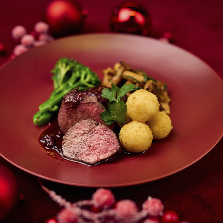 Zarte Rehmedaillons mit feinen Butterklößchen, Mini-Brokkoli, Pfifferlingen und Preiselbeeren – ein festliches Gericht mit harmonischem Zusammenspiel aus Wild, Gemüse und Frucht.