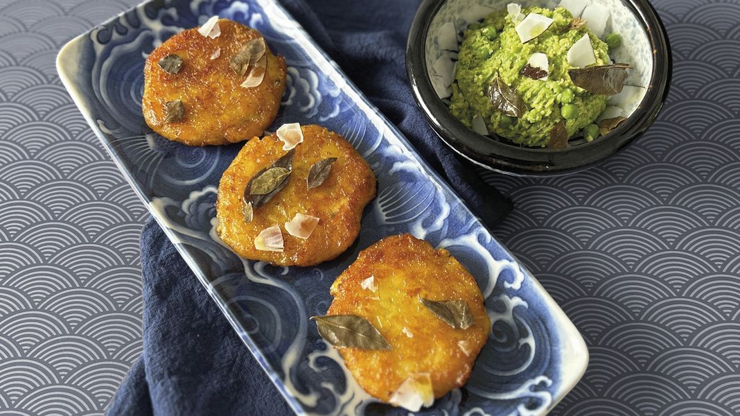 Zum Servieren die warmen Röstinchen auf Tellern anrichten, etwas von dem Erbsen-Kokos-Chutney darauf oder daneben geben und mit den beiseitegelegten Erbsen garnieren.