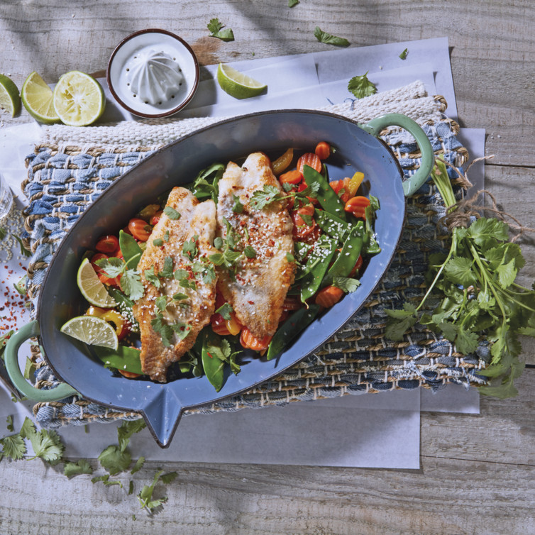 Währenddessen schmecken Sie das Gemüse mit Salz, frischem Pfeffer und Limettensaft ab, geben dann erst die Kaiserschoten hinzu und erhitzen diese ca. 3 Minuten.