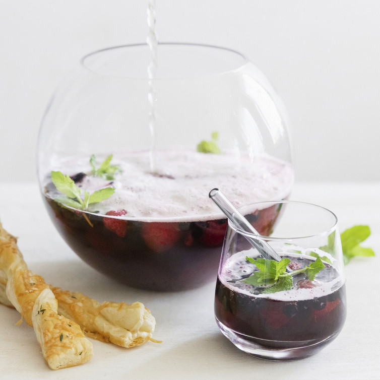 Mit Traubensaft, Weißwein und Prosecco aufgießen und mit Minze garniert in Gläsern servieren.
