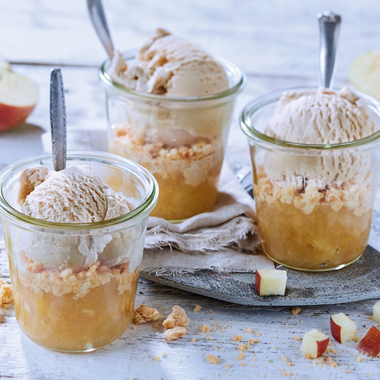 Die zerkleinerten Cookies auf das Apfelkompott geben und pro Portion eine große Kugel Haselnuss-Eis darauf setzen.