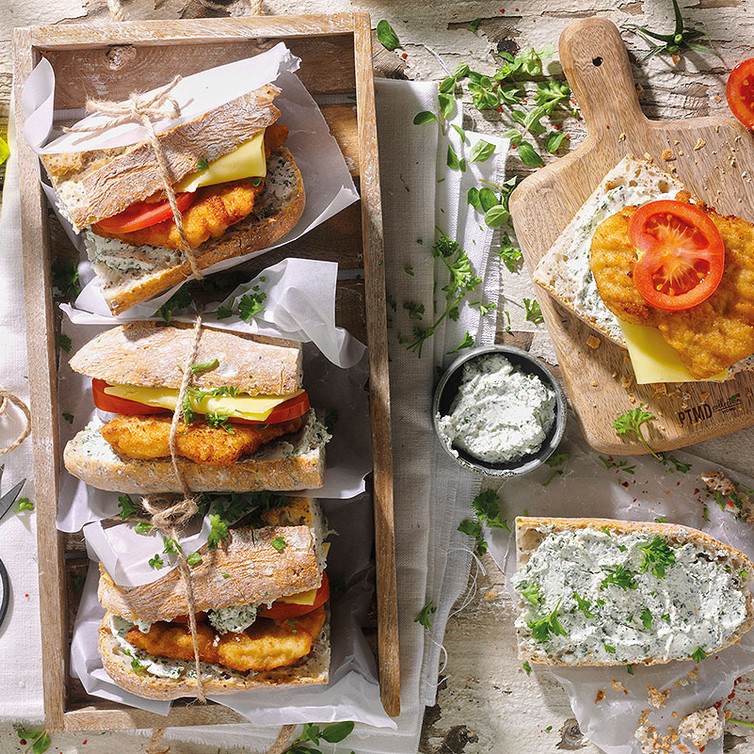 Landhausbaguette durchscheniden und aufschneiden. Beide Seiten mit Frischkäse bestreichen. Die unteren Baguette Hälfte mit Hähnchenschnitzel, Tomaten- und Käsescheiben belegen. Obere Hälfte auflegen und servieren.