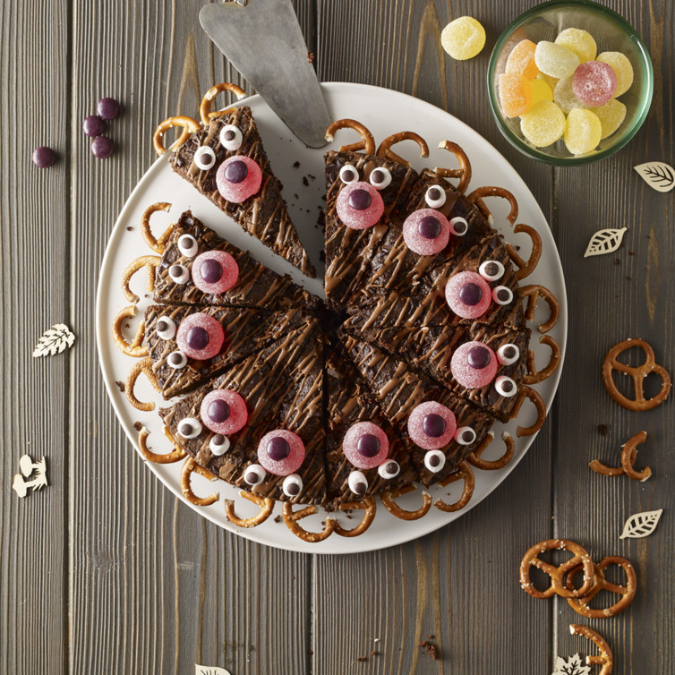 Die Brezeln werden entweder vorsichtig in den Teig gesteckt, dafür mit einem Zahnstocher die Löcher vorstechen, oder einfach das Brezel-Geweih mit Schokoschrift festkleben.