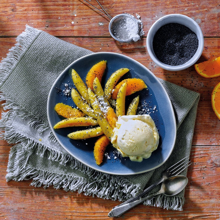Auf einem Teller eine Kugel Vanilleeis portionieren, die warmen Mohn-Schupfnudeln darum verteilen und nach Geschmack mit Puderzucker bestäubt servieren.