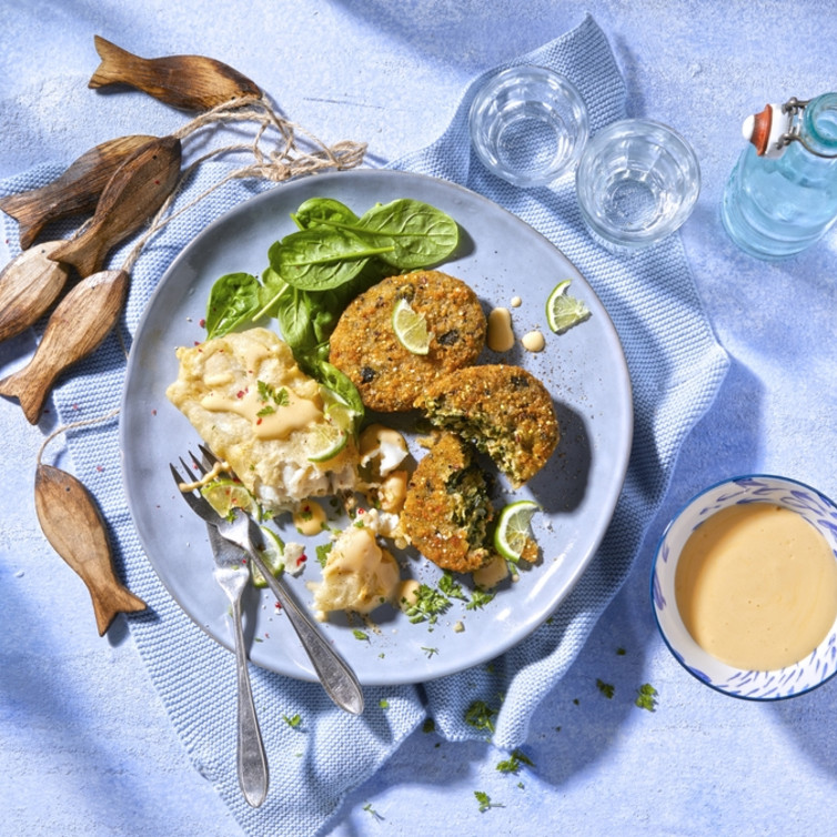Seelachs nach Packungsanweisung auftauen lassen. Für den Tempurateig Mehl, Stärke, Backpulver, Salz und Mineralwasser verrühren. Spinat-Medaillons nach Packungsanweisung im Backofen zubereiten.